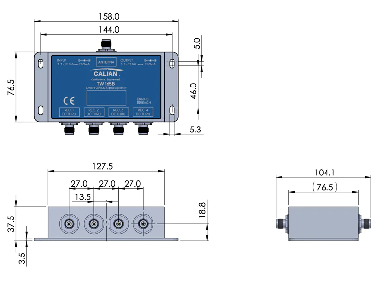 4 drogowy inteligentny dzielnik sygnału ( splitter/combiner) GNSS+ wzmacniacz 10 dB , IP67 Calian®