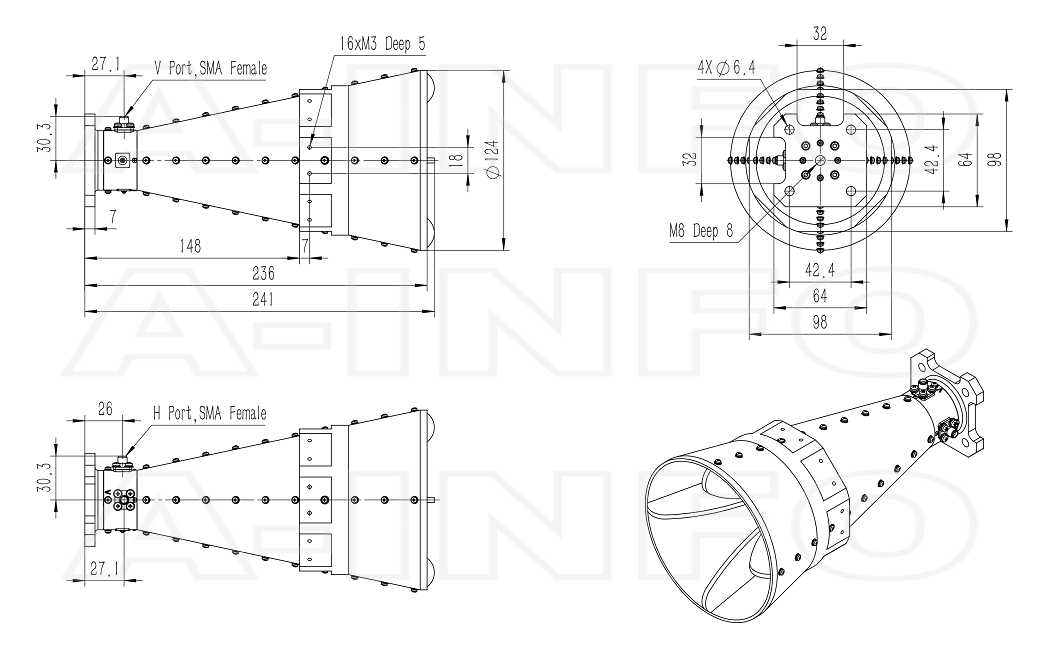 Stożkowa antena tubowa o podwójnej polaryzacji LB-CSJ-40400-2.4F, pracująca w zakresie częstotliwości od 4 do 40 GHz, ze Stożkowa antena tubowa o podwójnej polaryzacji LB-CSJ-20180-SF, pracująca w zakresie częstotliwości od 2 do 18 GHz, ze wzmocnieniem nominalnym 16 dB i niskim współczynnikiem SWR 1,5:1, wyposażona w żeńskie złącze wyjściowe typu SMA. Model LB-CSJ-20180-SF charakteryzuje się równomiernym wzmocnieniem w całym zakresie częstotliwości, zapewniając wysoką wydajność i kierunkowość. Może obsługiwać moc ciągłą 25 W i moc szczytową 50 W. Wykonana z lekkiego, odpornego na korozję aluminium, antena zapewni lata bezproblemowej pracy wewnątrz i na zewnątrz. Ta antena tubowa o podwójnej polaryzacji liniowej idealnie nadaje się do testów EMI, namierzania kierunku, monitoringu, pomiarów wzmocnienia anteny i charakterystyki kierunkowej oraz innych zastosowań.