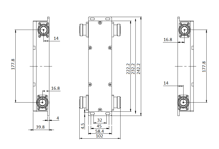 Sprzęgacz hybrydowy szerko pasmowy 3 dB na zakres 380-2700 MHz typ 7-16 żeński , Low PIM